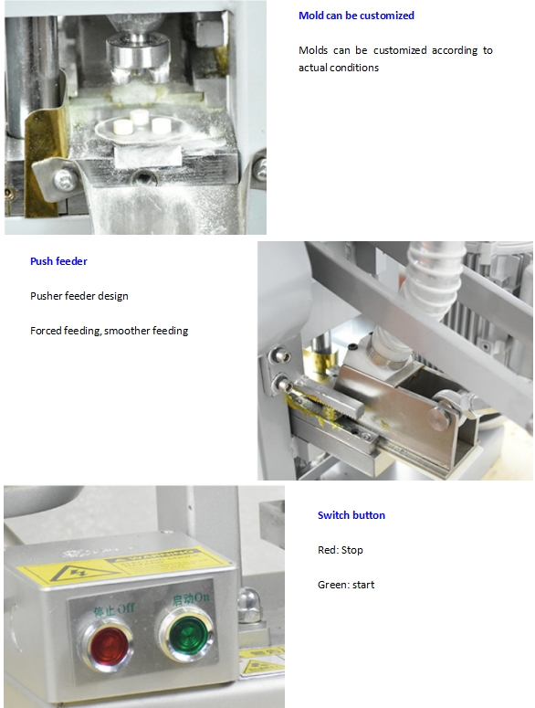 This machine is a mini type desktop tableting machine, driven by motor and can continually punch various tablets.the machine can punch fine grain and coarse powder into circular tablets or irregular shape tablets;and it can be used for laboratory production or small batch production of tablets,sugarcoated tablets,calcium tablets,irregular shapes,ect.
